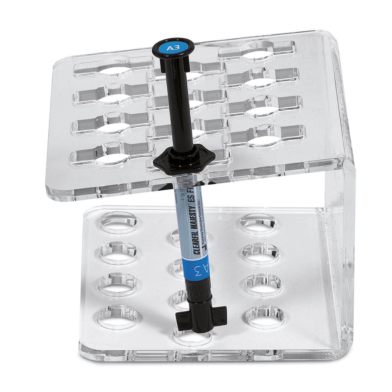 Plexiglass organizators ar 12 caurumiem šļircēm, ar caurumiem šļircēm Flow tetric stilā.