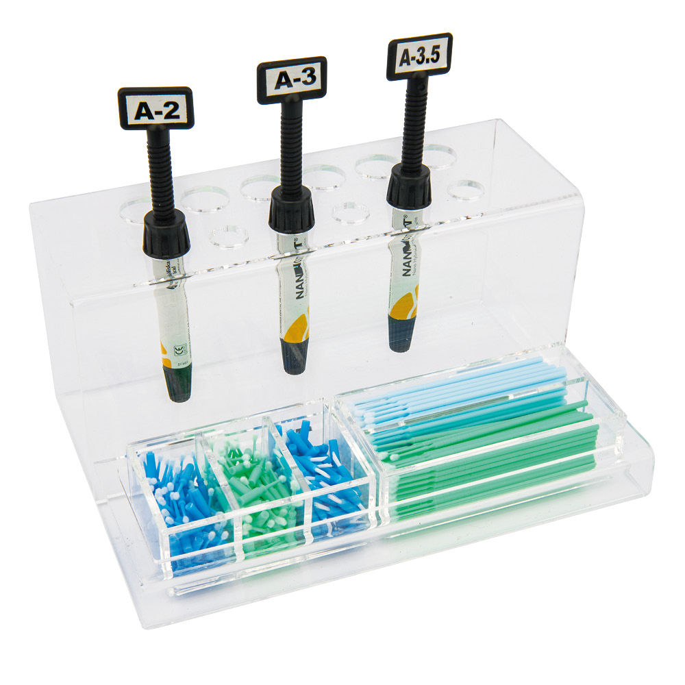 Plexiglass organizer with 12 holes for syringes, four round compartments for bottles and 1 container